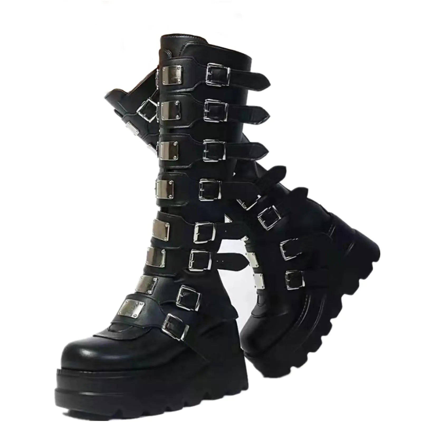 These punk mid-calf boots feature striking metal accents that complete your alternative look. The round toe design and wedge platform create a bold silhouette that commands attention wherever you go.