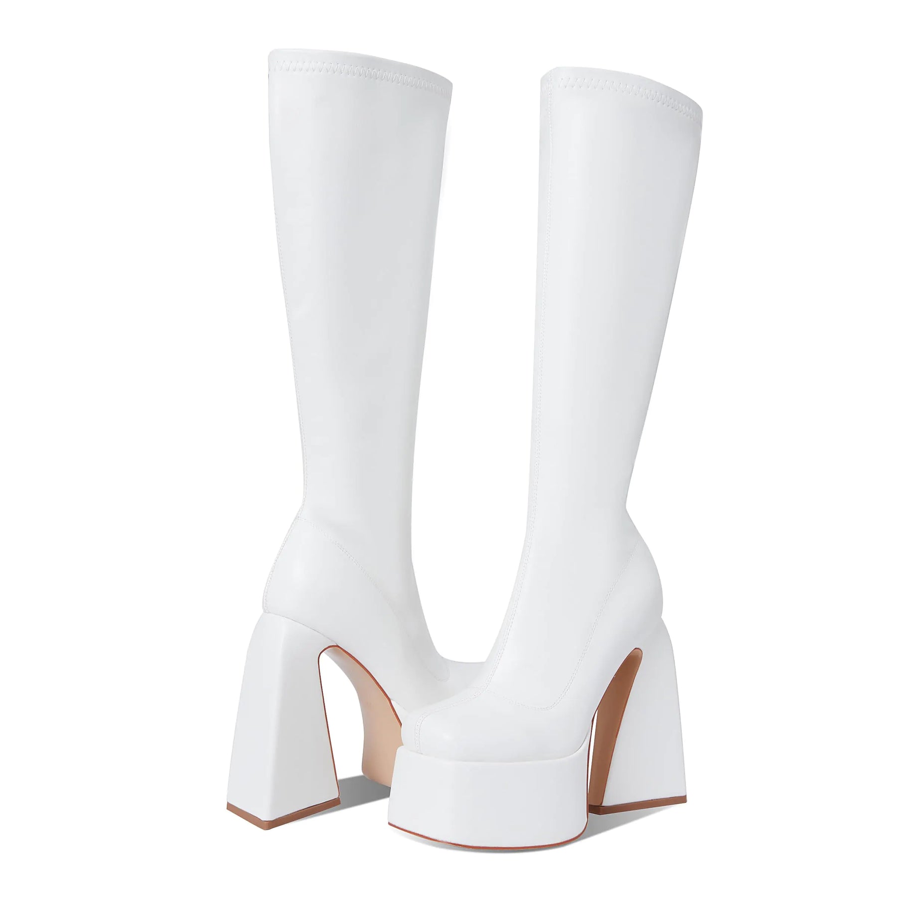 White Platform Knee High Boots - Square Toe Chunky Heel Punk Style Boots